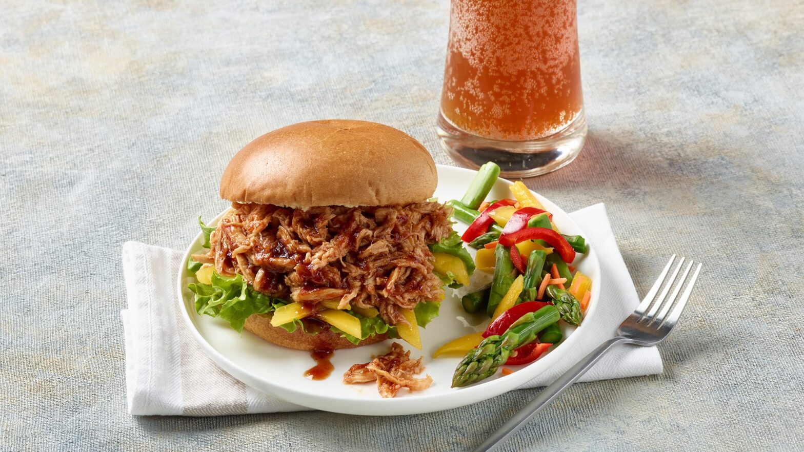 • On the bottom of each bun, place baby greens or lettuce, add a few slices of fresh mango, a nice portion of shredded chicken, then a drizzle of Pat BBQ sauce.
