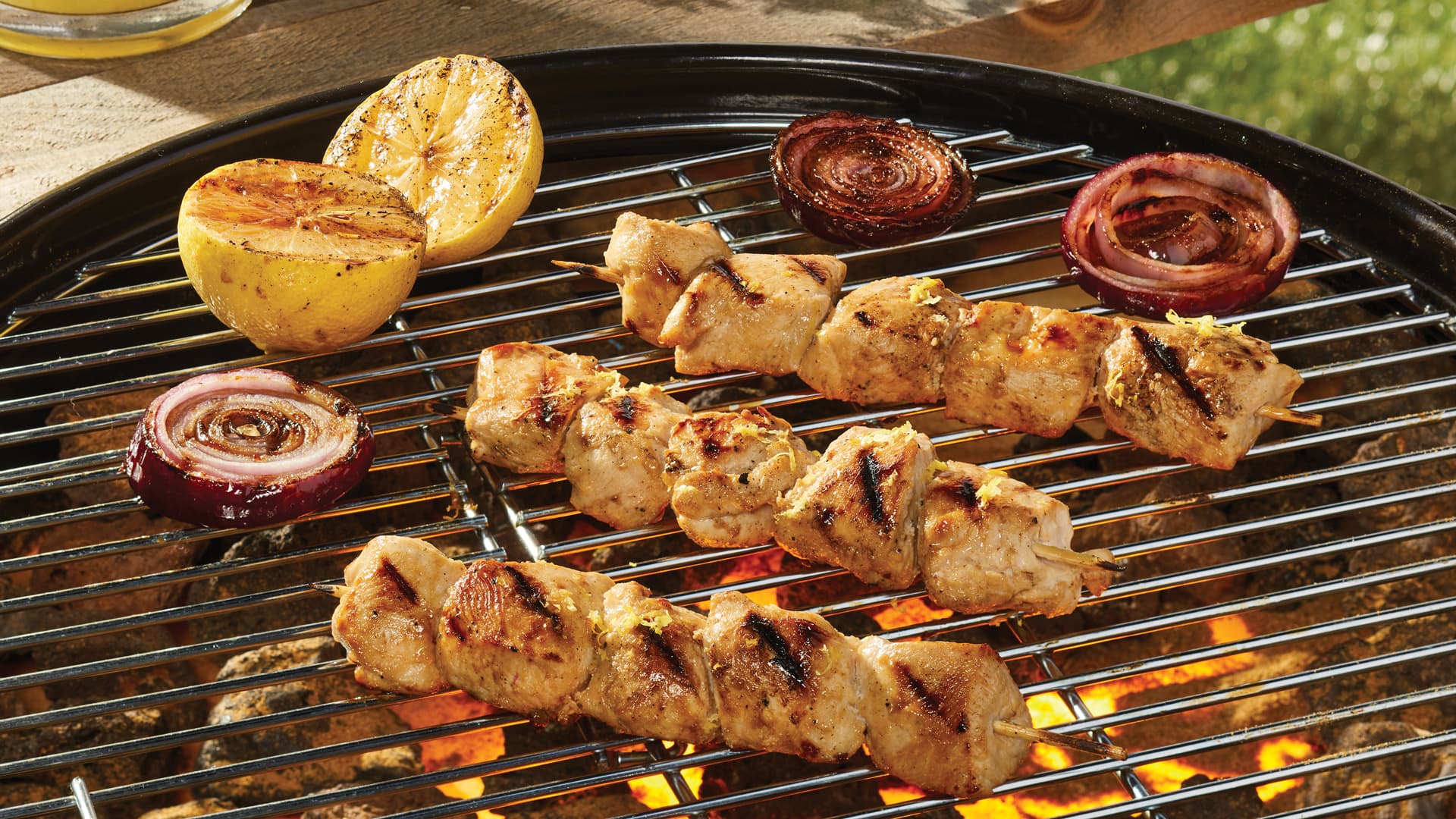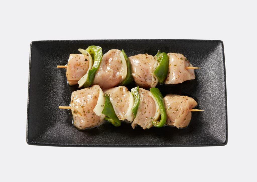 • 4 cubes de poulet par brochette, oignons et poivrons