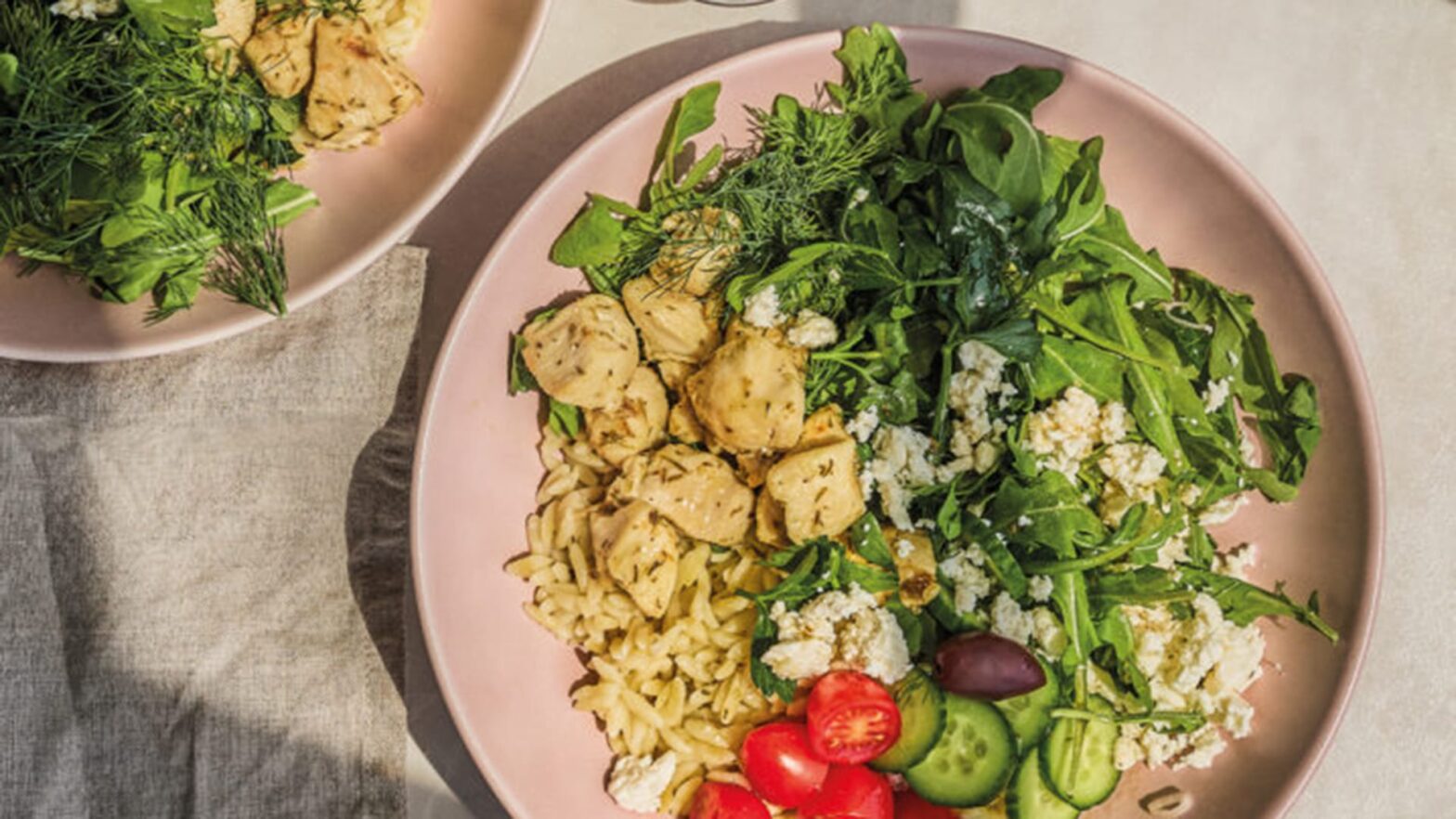 • Remplir des bols d’orzo, de roquette, de concombre, de tomates cerises, d’échalote, d’olives et de féta. Ajouter le poulet, puis garnir avec le persil et l’aneth et servir avec la vinaigrette.