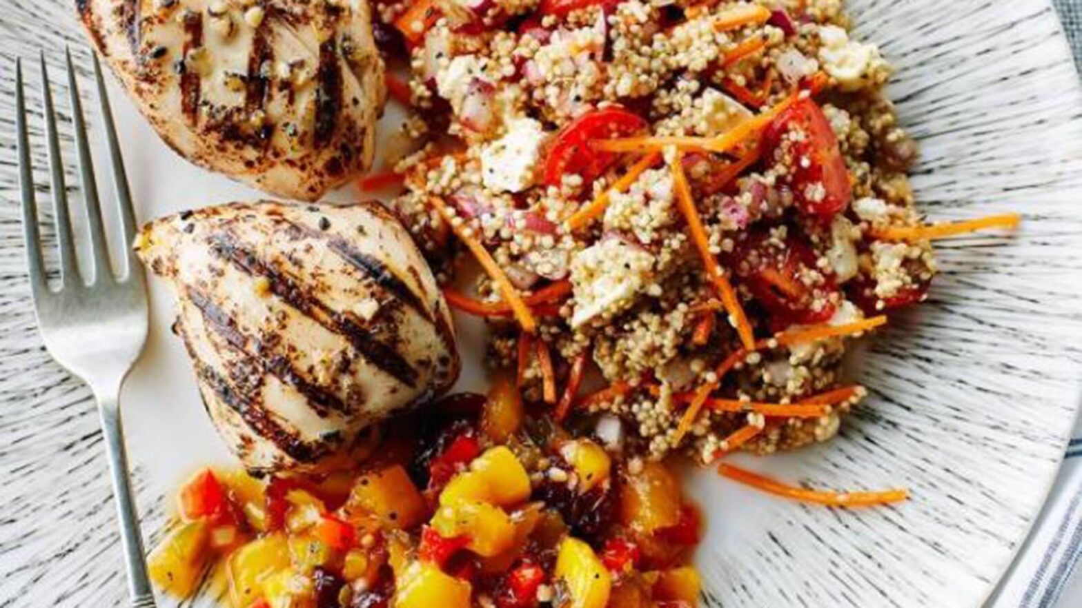 - Servir le poulet avec le chutney à la mangue et la salade d’été au quinoa.